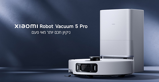 שואב שוטף רובוטי Robot Vacuum 5 Pro מבית Xiaomi בעוצמת שאיבה חזקה במיוחד 20000PA, סוללה עוצמתית 5200mAh לשימוש ממושך, 3 מצלמות AI לזיהוי מעל 200 חפצים ו-47 סוגי כתמים וחיבור אלחוטי ליישום Mi Home בעברית.