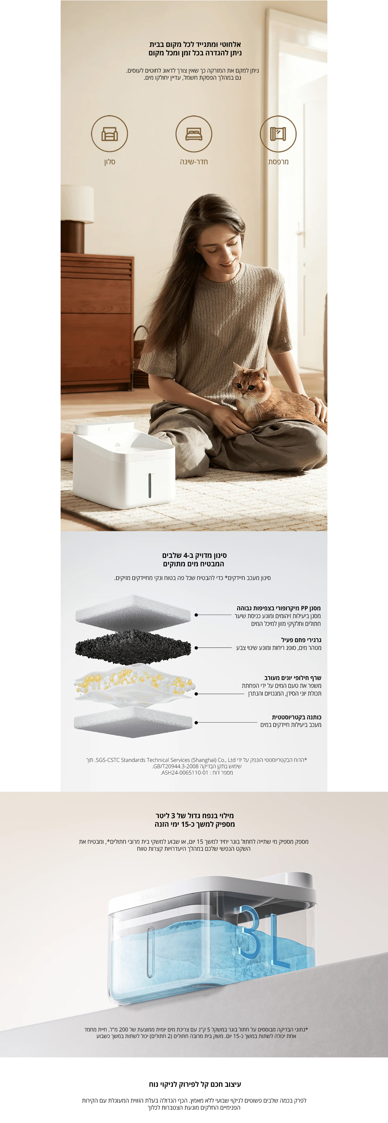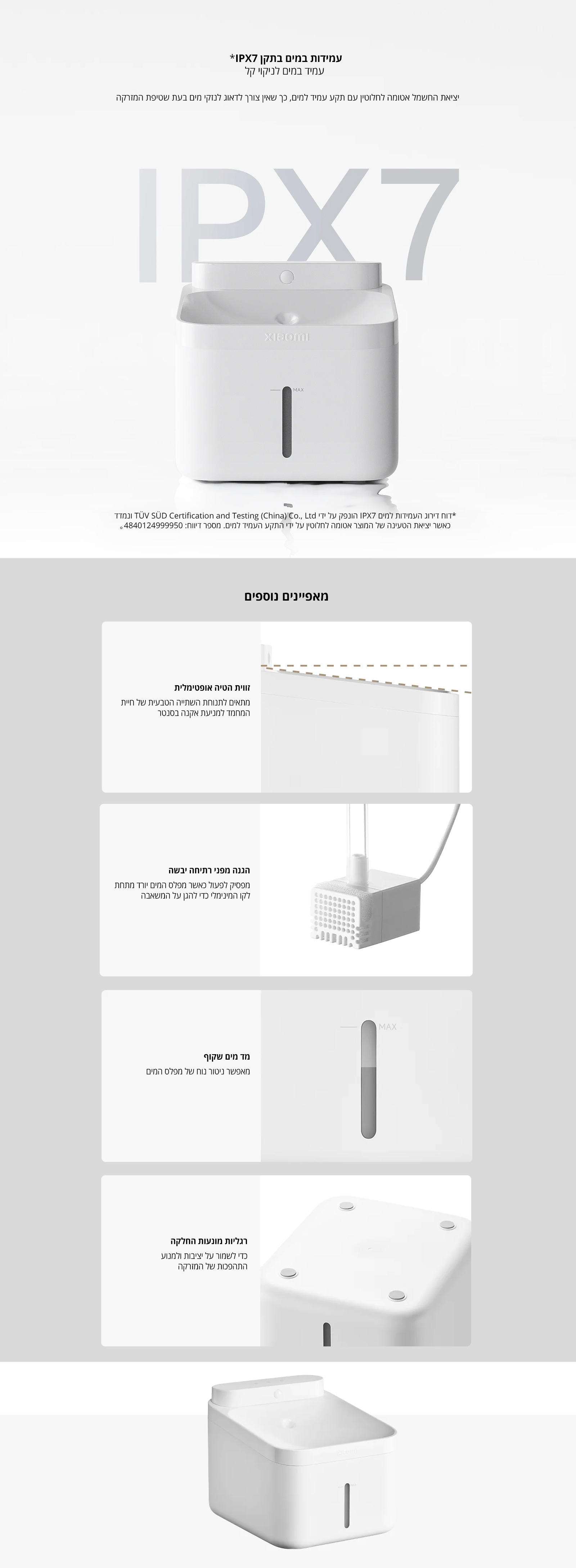 מיכל המים והמכסה עשויים כולם מחומרים העומדים בדרישות התקינה ונבדקו על-ידי מעבדה מוסמכת, ומבטיחים מים נקיים, באיכות גבוהה ובטוחים לחיות המחמד.