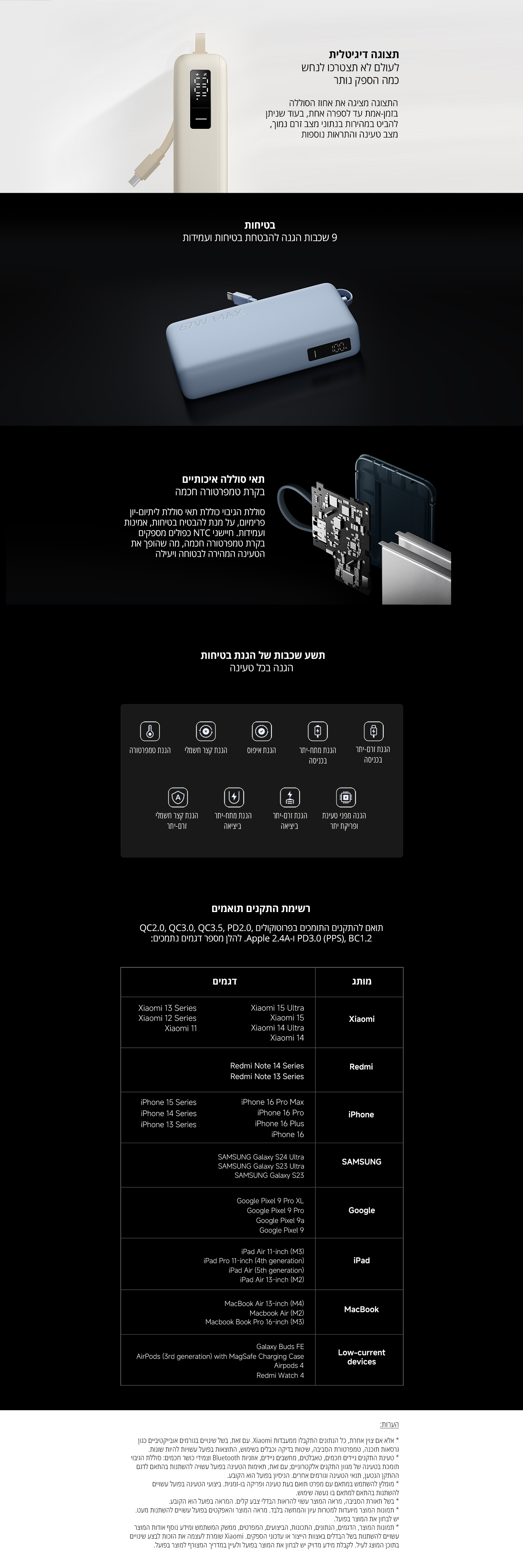 בטיחות מעל הכל - 9 מנגנוני הגנה לבטיחות מלאה של המשתמש וההתקנים הניידים; תאי סוללת ליתיום-יון איכותיים, בטוחים, אמינים ועמידים לאורך זמן בשילוב תכונות הגנה מתקדמות המנהלות ביעילות בעיות כגון: טעינת יתר, פריקת יתר, טמפרטורות גבוהות וקצר חשמלי, ומבטיחות שימוש יומיומי בטוח.