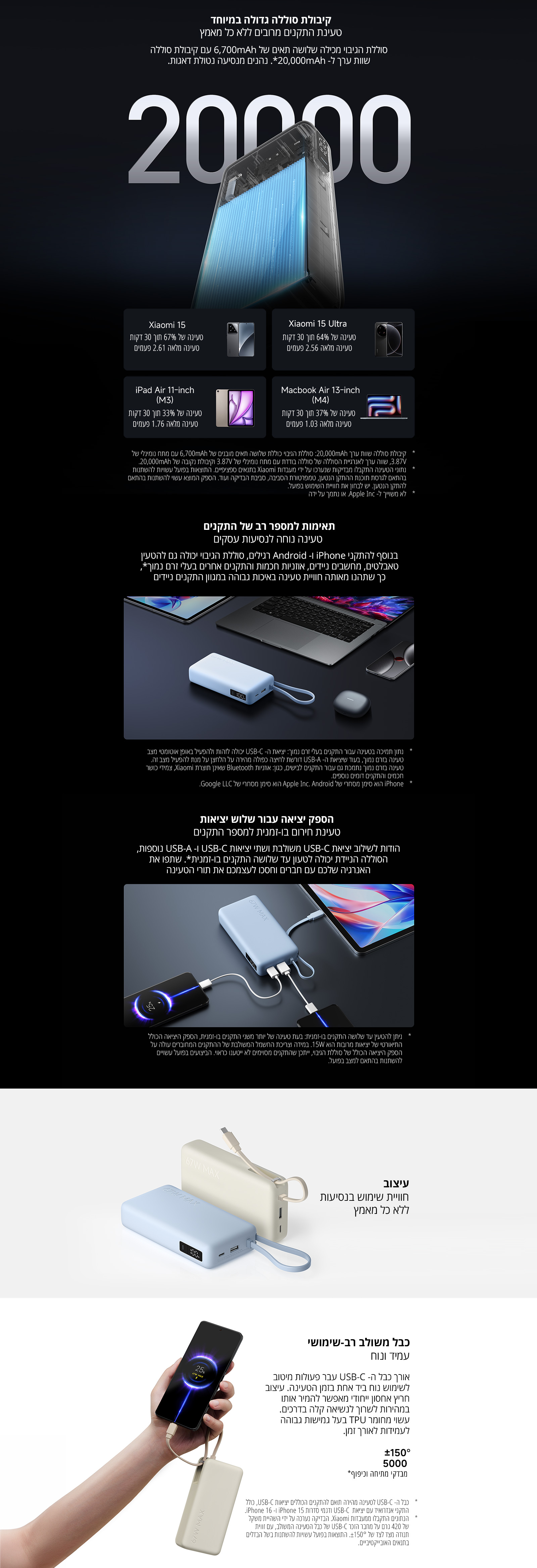 כבל משולב עמיד - מכסה את כל צרכי הטעינה היומיומיים שלכם, כך שאינכם צריכים לשאת כבלים נוספים; חריץ האחסון הייחודי מאפשר להפוך את הכבל המשולב לשרוך נשיאה נוח; כבל הטעינה עשוי TPU בעל גמישות גבוהה, עמיד ובנוי להחזיק מעמד (נבדק בלמעלה מ-5000 כיפופים ובטווח זווית ±150°)