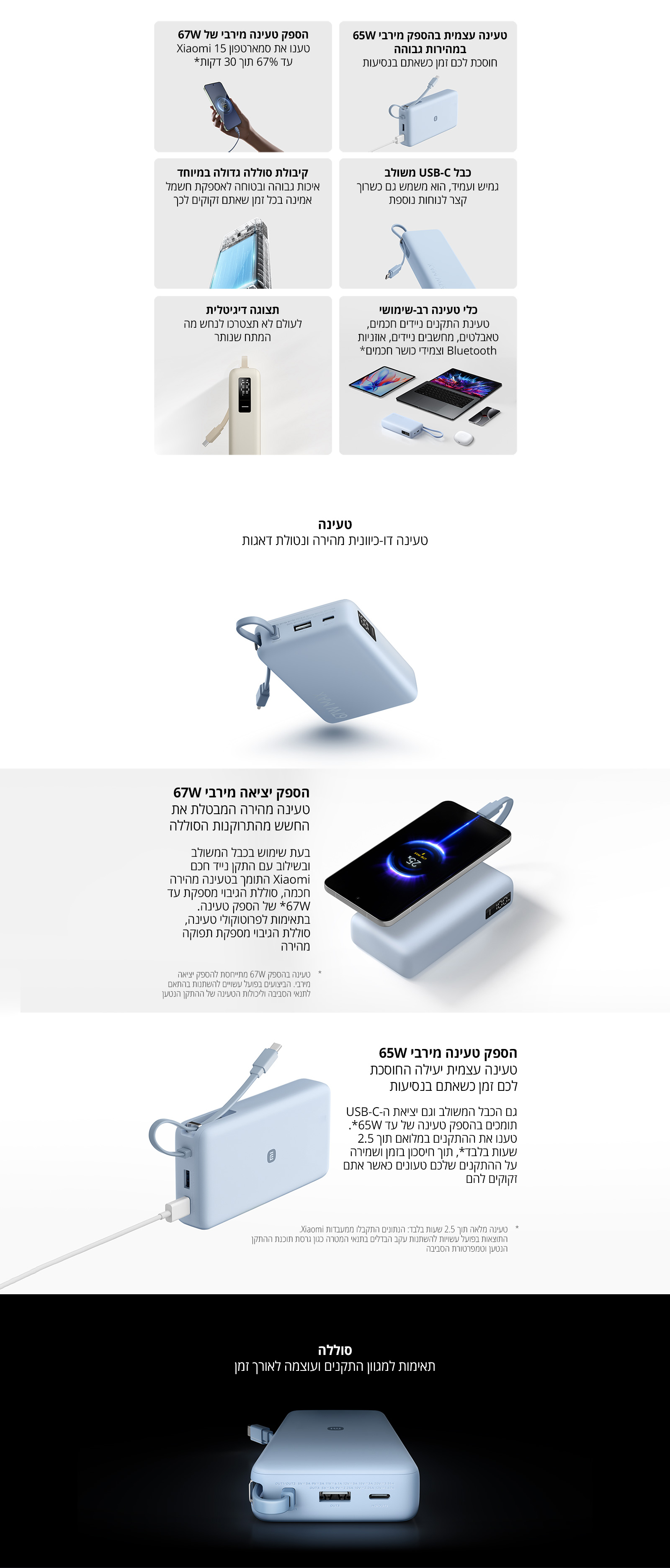 סוללת גיבוי 67W 20000mAh עם כבל מובנה Xiaomi