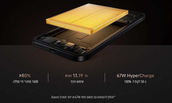 תמיכה בטעינה חוטית מהירה 67W HyperCharge (כ-50 דקות ל-100% במצב Boost).