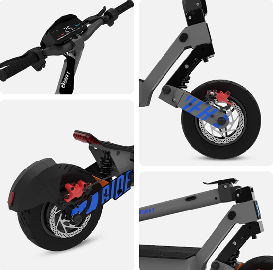 קורקינט RIDER X RACE מצויד בסוללת 60V 21AH, המאפשרת טווח נסיעה של עד 60 ק״מ. הגלגלים הגדולים בקוטר 11 אינץ’ עם צמיגי אנטי-פאנצ’ר מספקים יציבות מקסימלית ותחושת ביטחון ברכיבה. מערכת שיכוך מלאה מבטיחה נסיעה חלקה, גם בתנאים משתנים ובתוואי דרך מאתגרים.